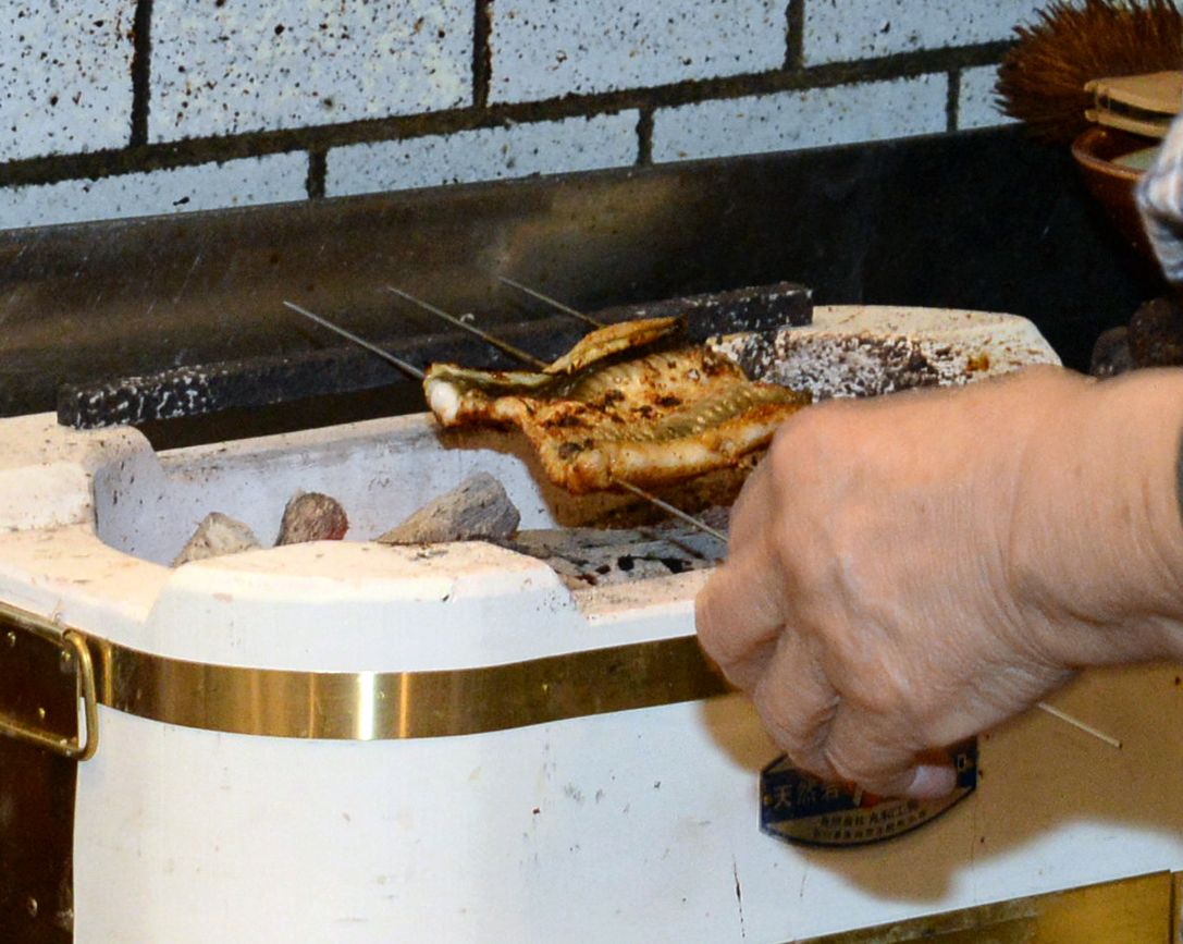 尚子夫人の穴子の「焼き」の腕前は、先代からの“一子相伝”である。以前は和歌山県の紀州備長炭、現在は宮崎県の日向備長炭を使っているが、団扇を煽(あお)ぎながら焼いている途中、パチパチと火の粉が飛び散ることがある。