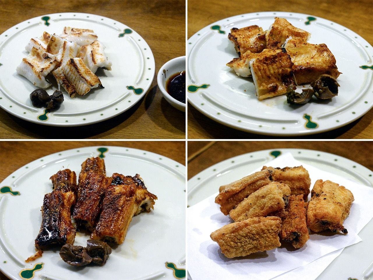 (左上から時計回り)穴子の素焼、穴子のすずめ焼、穴子の素揚、穴子の照り焼 撮影:嵐田啓明