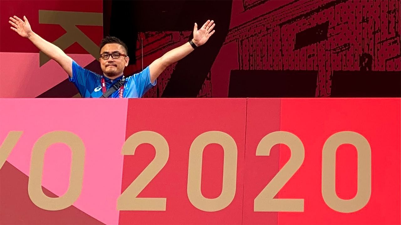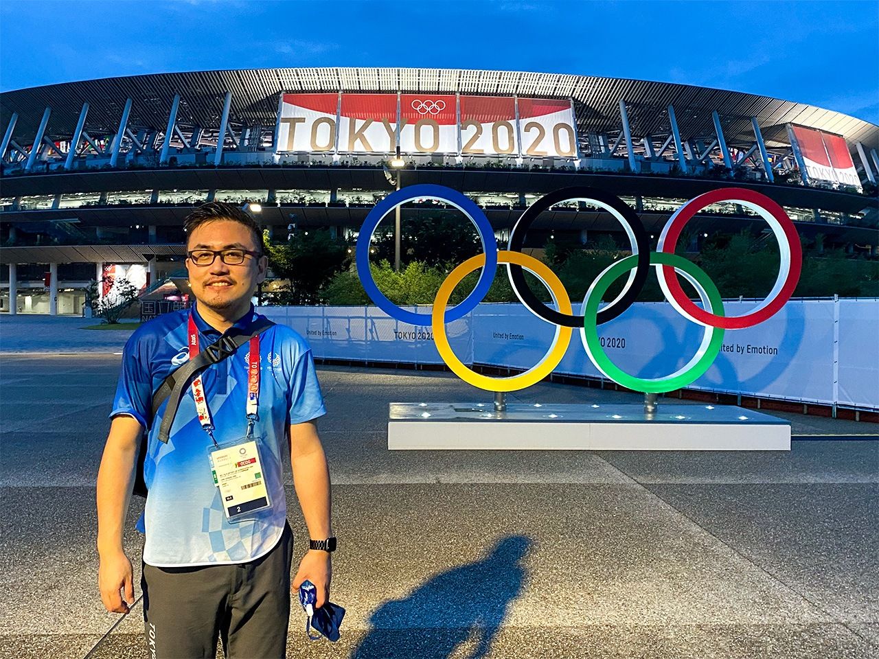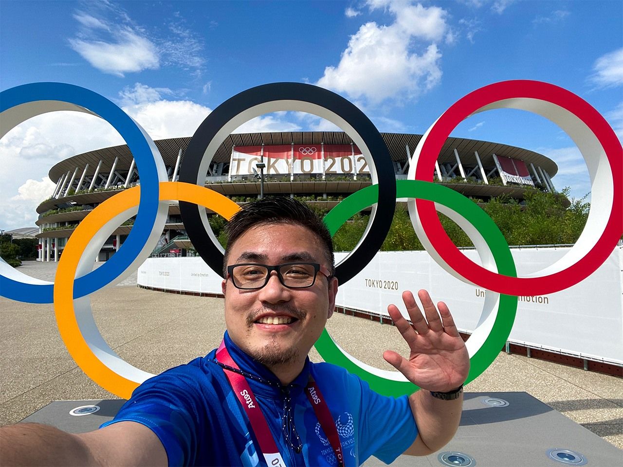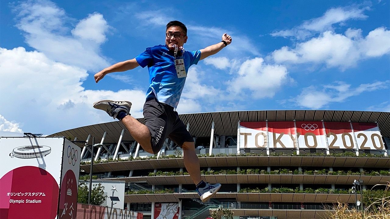バナー写真=長年、東京で働いている台湾出身の姚宣宏さん。愛する日本のため参加した東京五輪の大会ボランティアで、毎日通った国立競技場の前でジャンプ!