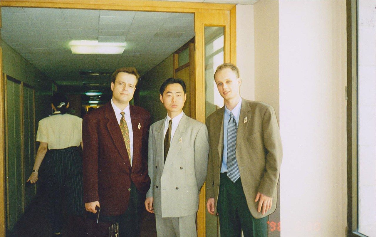留学先のモスクワ国際関係大学の同級生と筆者(中央)1996年 筆者提供