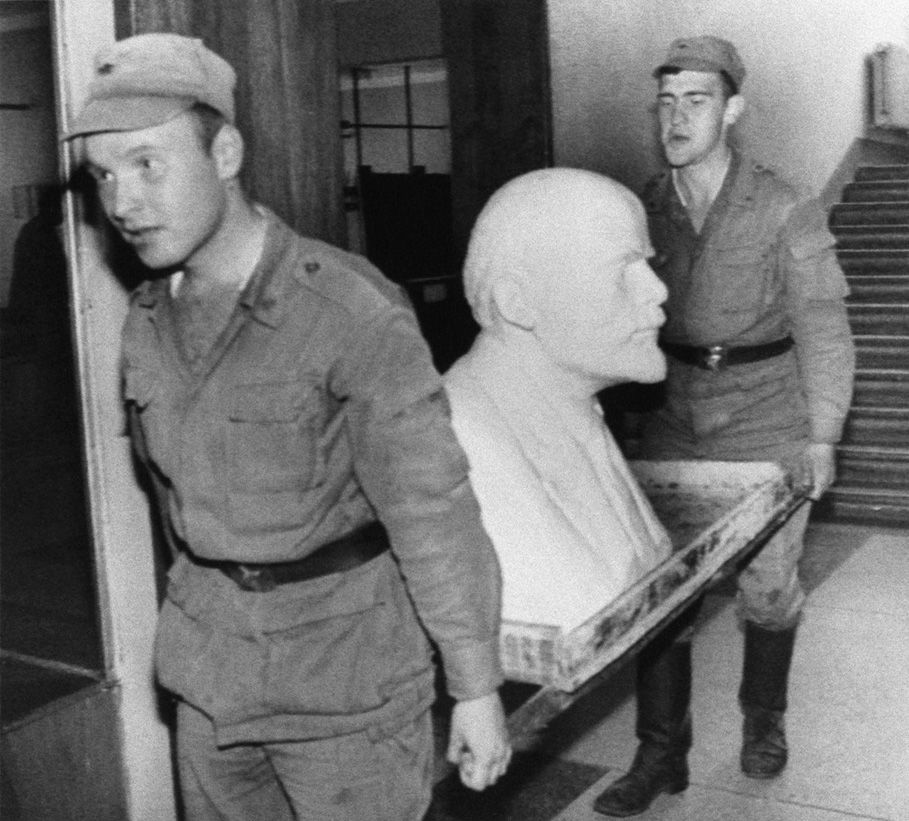 モスクワのソ連軍学校内にある共産党支部からレーニンの胸像を運び出す兵士(1991年08月25日 ) ロイター=共同