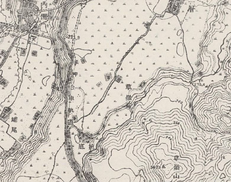 1921年の日本統治時代に作られた2万5000分の1の地形図を見ると、まん中左あたりに「手押台車軌道」とある(提供:中央研究院人文社會科學研究中心地理資訊科學研究專題中心)