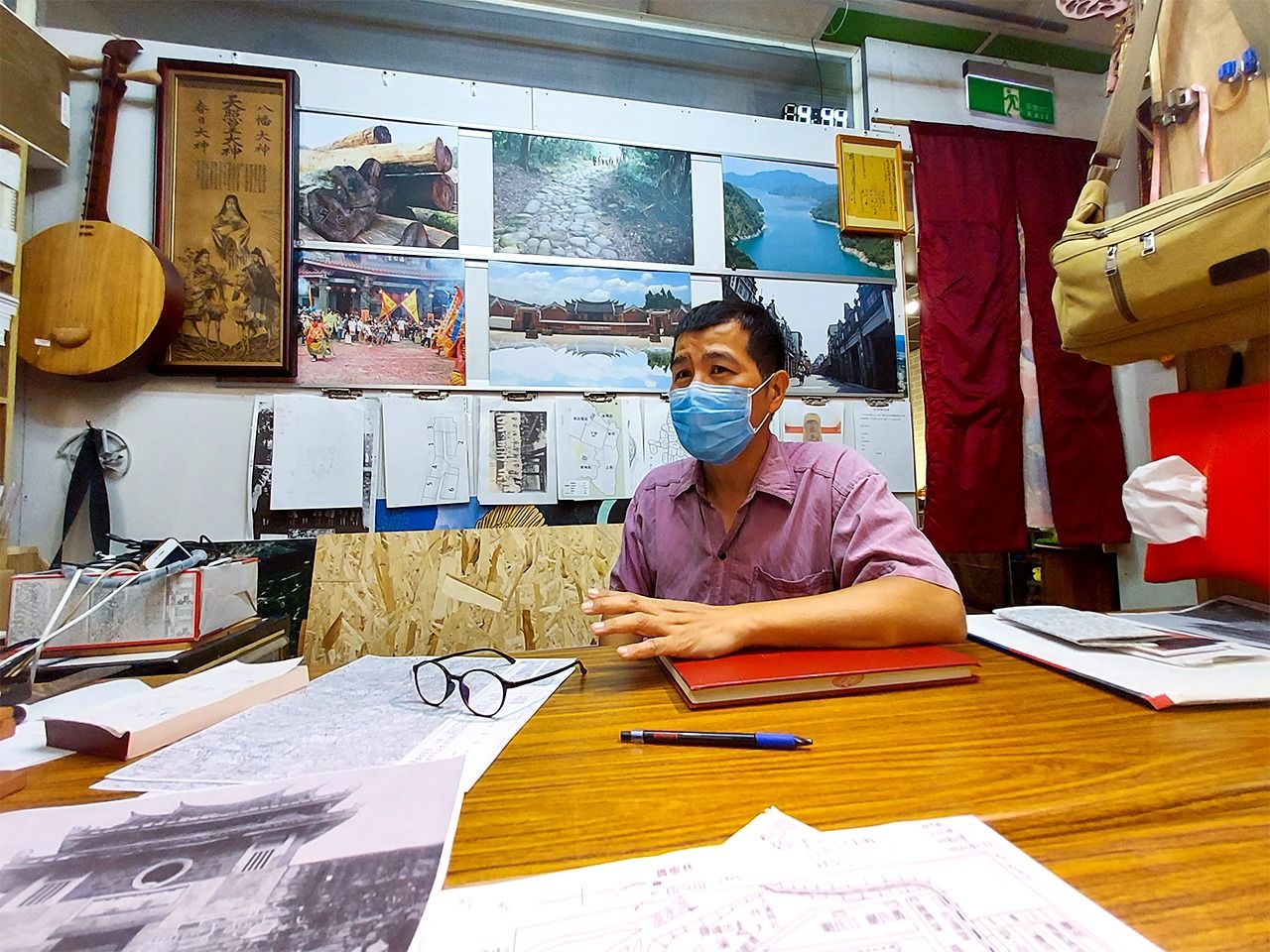 黃さんは地元の大渓に戻り、「大渓文化調査者」として活動をはじめる。現在は室内設計デザインのほか、桃園市各地のガイドや大渓文化協会の理事を務めながら、行政と地域と観光を繋げるお店「達文西瓜芸文館」を夫婦で経営。お店の奥にある部屋は、壁一面が歴史資料や本や写真で埋まっている。