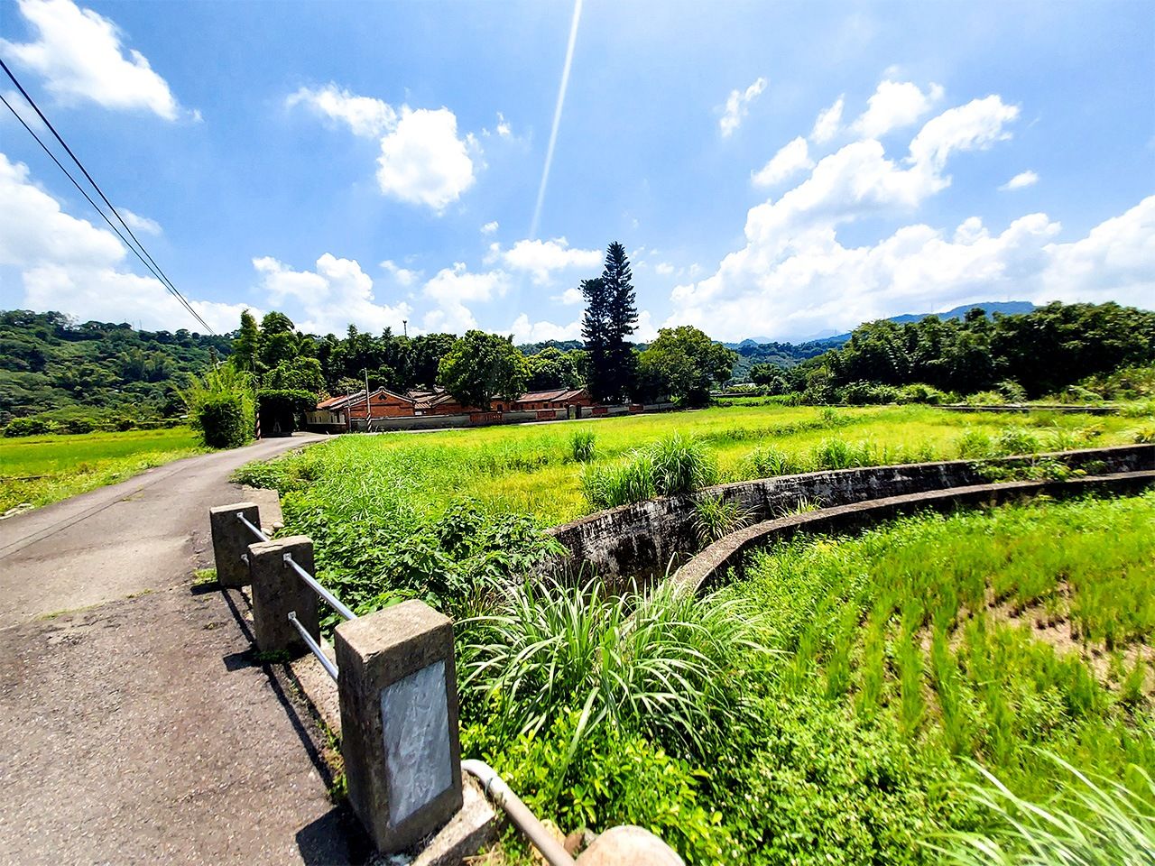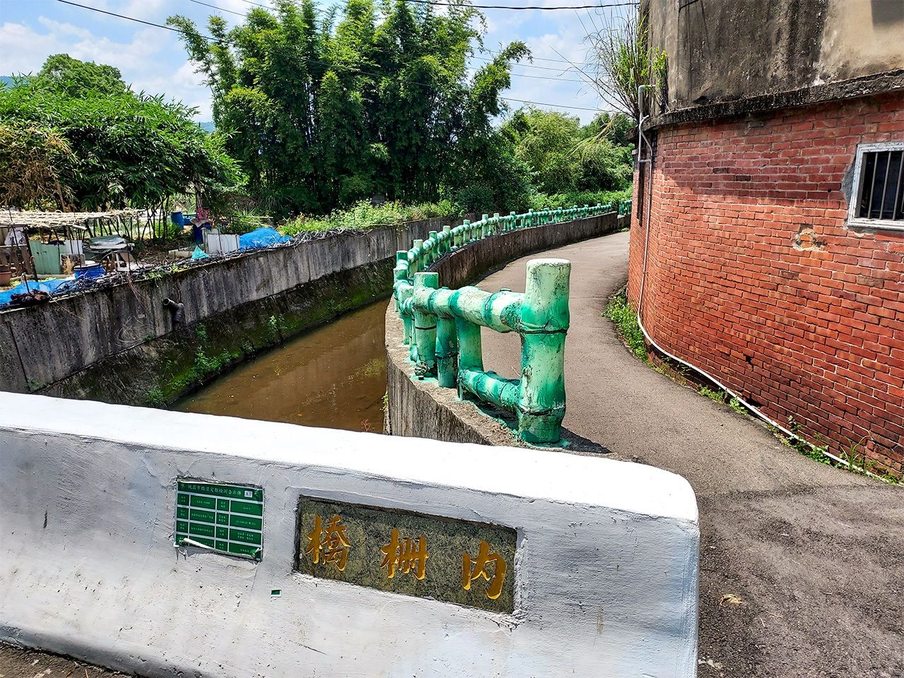 用水路の橋の向こうに「永安居」、その後ろの山を越えれば「慈湖」のある草嶺山がある