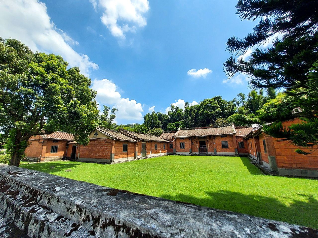 台湾の田舎でこうした三合院は珍しくないけれど、この永安居はこれまで見たなかでも極めて状態が良く、美しく保存されている。なんでも大渓老街の和平通りで徳記商行という貿易会社をつくった豪商、簡送德の屋敷だそうで今は桃園市の文化財という。なんとなく違和感があるのは、建物の前の庭が芝生だからと気づいた。本来的に三合院の中庭は、洗濯物を干したり鶏を放し飼いしたり、地域の人が集まったりする生活感あふれる場所である。だから余計に、綺麗に刈り込まれた芝生の緑と赤煉瓦のコントラストが眩しく幻想的にみえるのかもしれない。