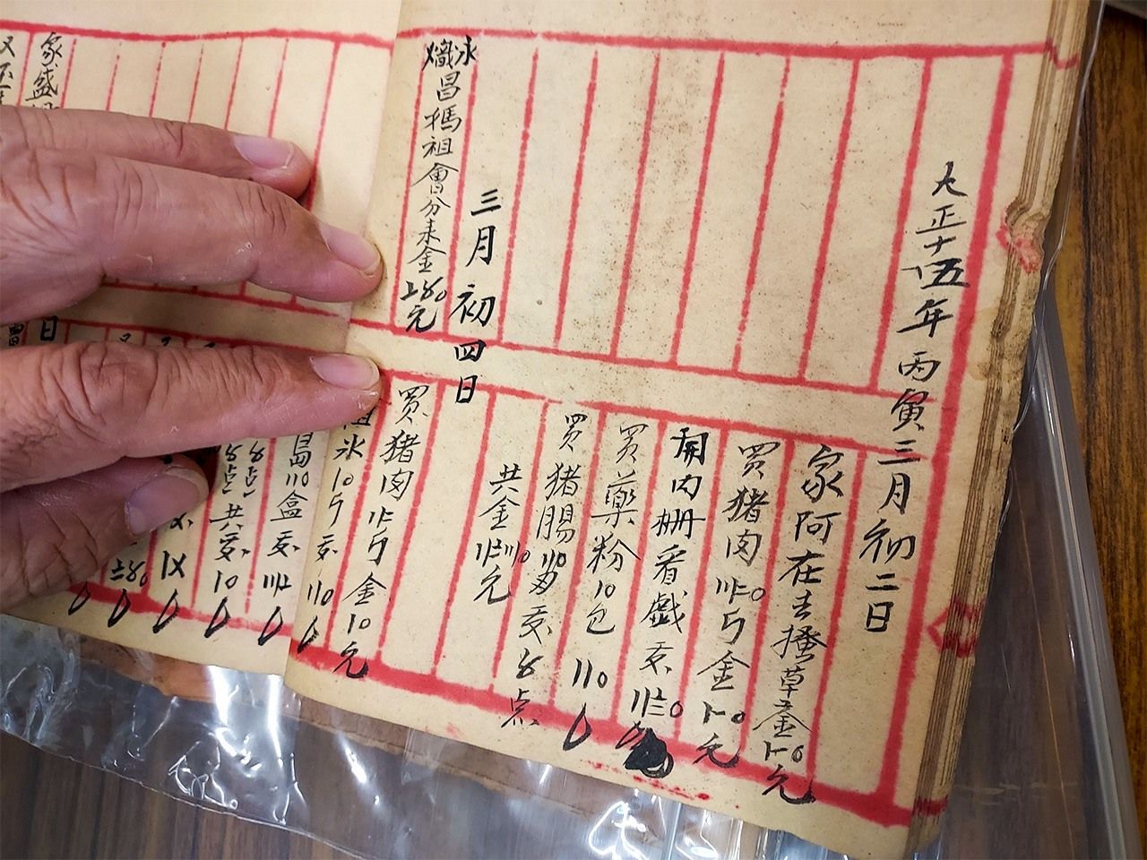 黄建義さんが見せてくれた大正15年の頃の、とある家庭の家計簿、右から4行目に「内柵で観劇」とある