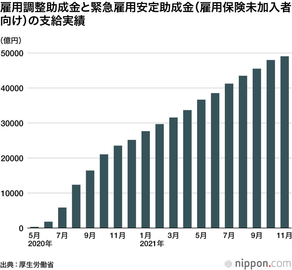 雇用調整助成金の恩恵が行き届かず、職を失った非正規労働者が多数存在している一方で、助成金を支える財政は火の車だ。雇調金は労働保険特別会計で管理され、企業と従業員が支払う雇用保険料で賄われてきた。しかし、コロナ下の特例措置で助成金の支給額は膨れ上がり、2020年度来の累計で現在5兆円に迫っている。