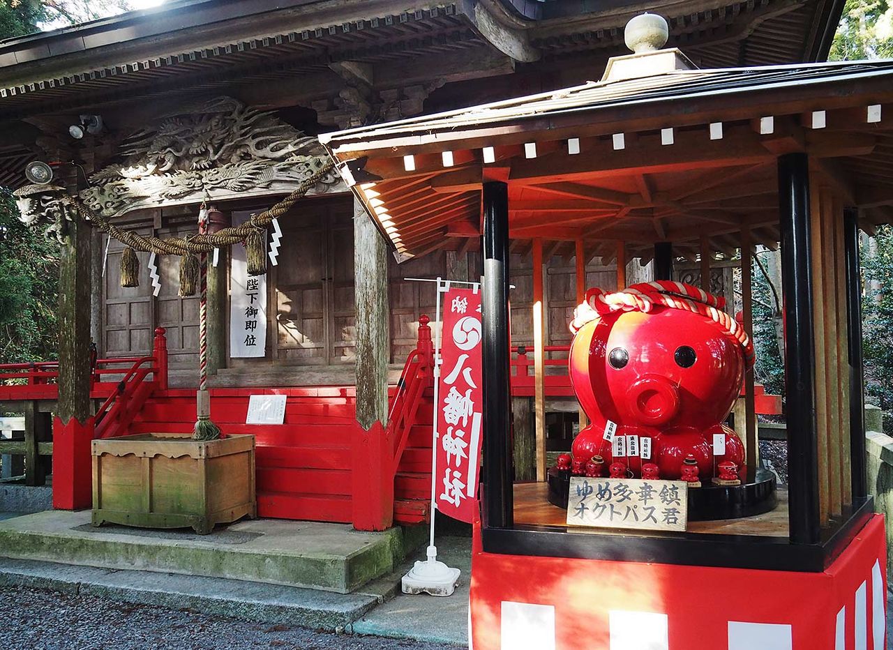 宮城県南三陸町の中心部にある「南三陸志津川さんさん商店街」から北西に5キロほど行くと、山に囲まれた入谷地区に入る。その地区のシンボルが入谷八幡神社だ。静粛でピンと張り詰めた冷たい空気の中、長い石段を上ると、本殿の横に鎮座する真っ赤なタコのブロンズ像が目に飛び込んでくる。