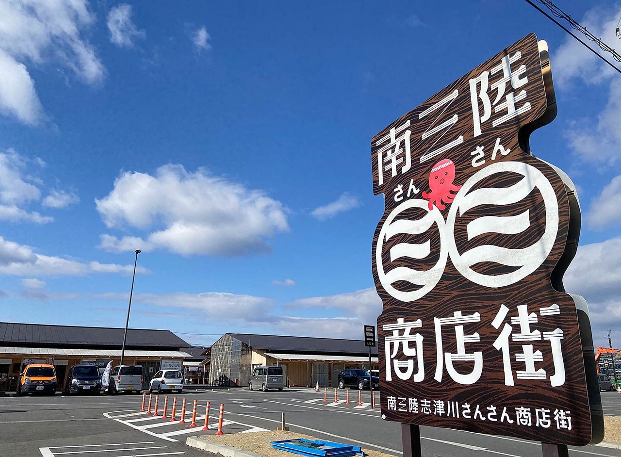 「南三陸志津川さんさん商店街」の看板にもオクトパス君が描かれている