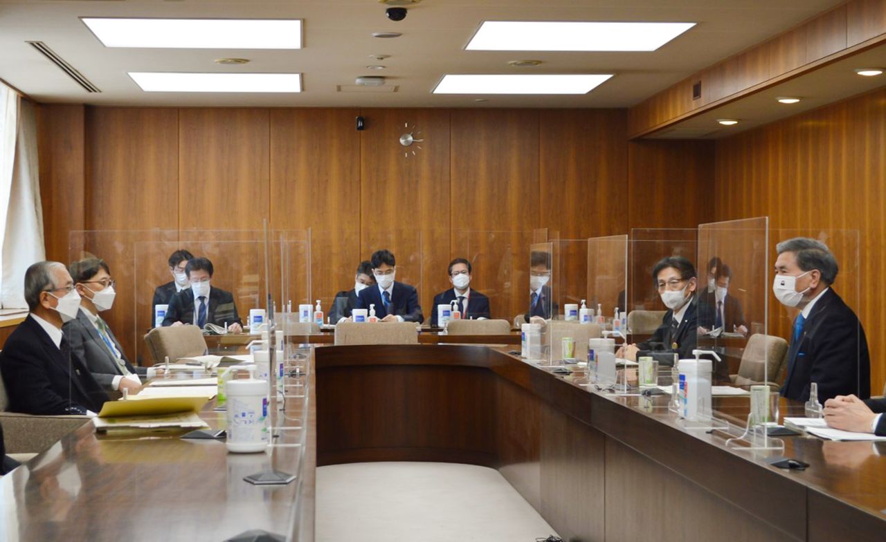 アサリの産地偽装対策について、金子原二郎農林水産相(左端)に陳情する蒲島知事(右端) 写真:時事