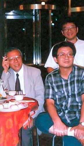 1995年9月民族学研究所設立40周年のパーティで。前列右が著者、著者の後ろの白シャツ姿が王甫昌、左のネクタイ姿が社会学者瞿海源教授。瞿教授は1990年3月の「野の百合運動」の時に李登輝と会見したハンストの学生に付き添って総統府に入ったことのある人(写真出所:中央研究院社会學研究所『我與社会所:中央研究院社会學研究所成立二十周年紀念專刊』、2015年)(筆者提供)