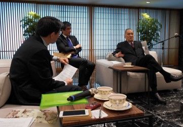 筆者(左)のインタビューを受ける彭明敏氏(右)。2015年11月30日、於台北(筆者提供)