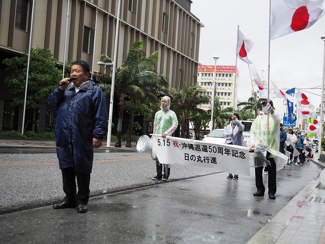 午前10時すぎ、再び県庁に戻ると、県民広場では「琉球独立」と書かれたのぼりや横断幕を持ったグループが陣取っていた。しばらくすると、今度は別の団体が「沖縄返還50年、おめでとうございます」などと声を上げ、日の丸を掲げながら近づいてきた。その団体は止まることなく国際通りに入り、そのまま行進を続けていった。