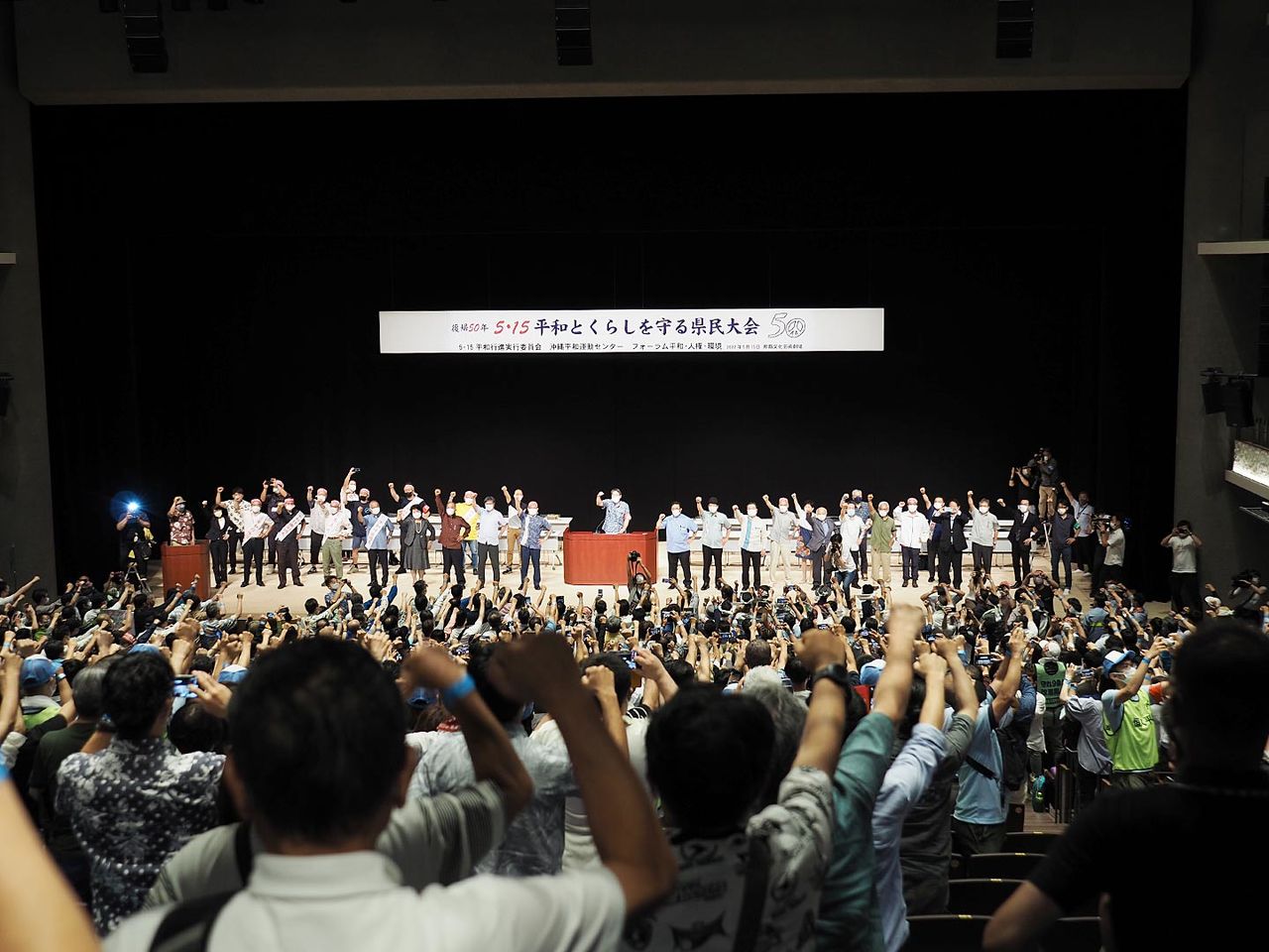 ちょうどそのころ、2021年10月に開館したばかりの文化施設「那覇文化芸術劇場なはーと」の大ホールでは、5・15平和行進実行委員会が主催する「5・15平和とくらしを守る県民大会」が開催されていた。主催者の発表によると、参加者は約1000人。県外からの参加も多かった。