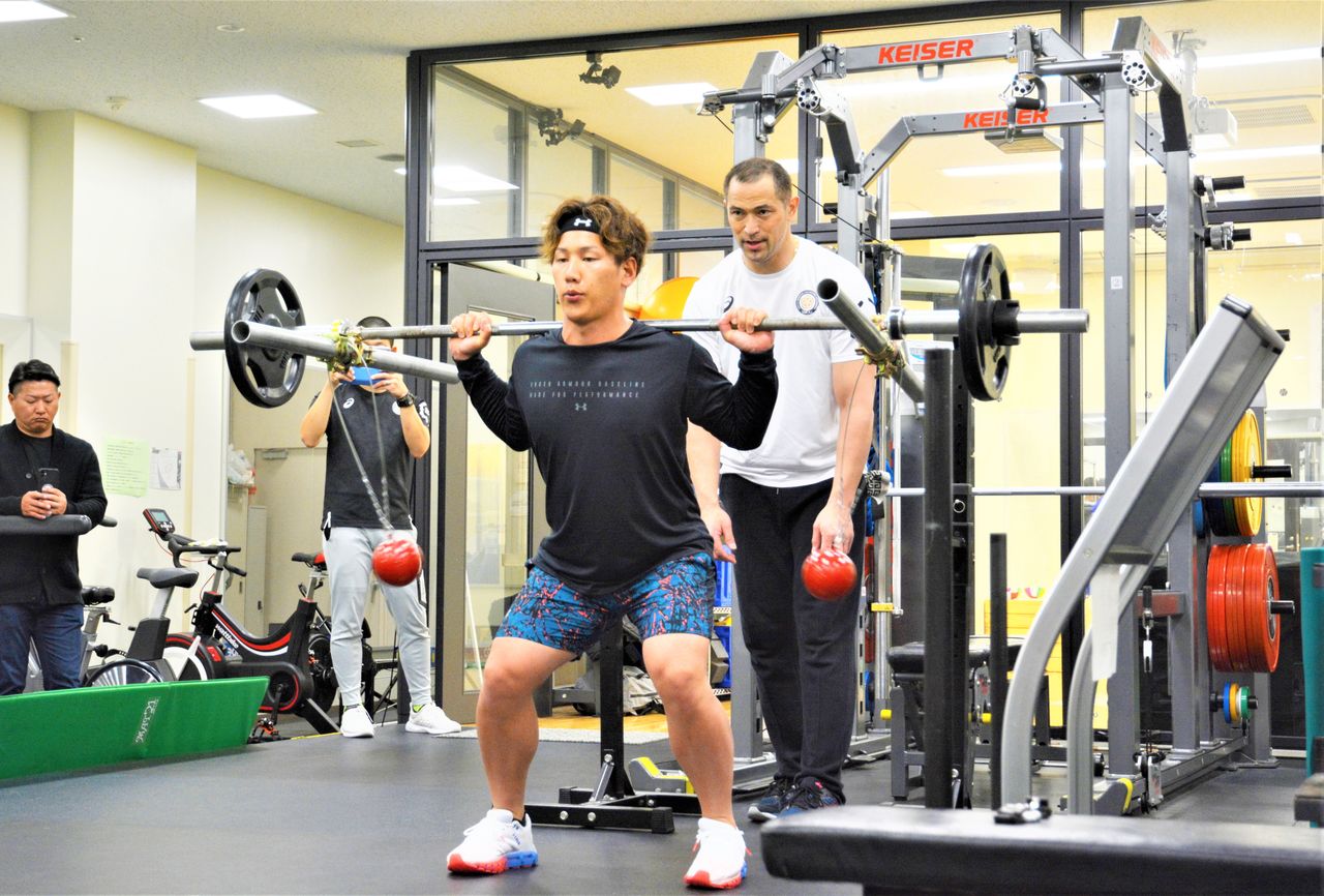 ハンマー投げで使う砲丸を両端にぶら下げた不安定なバーベルを担いだり、紙風船を使ったり、室伏氏のメニューは多岐にわたる。単に筋力を向上させるだけでなく、体のバランスを整え、筋力を効率よく野球のプレーに結びつけたり、けがの予防にもつながるものだ。