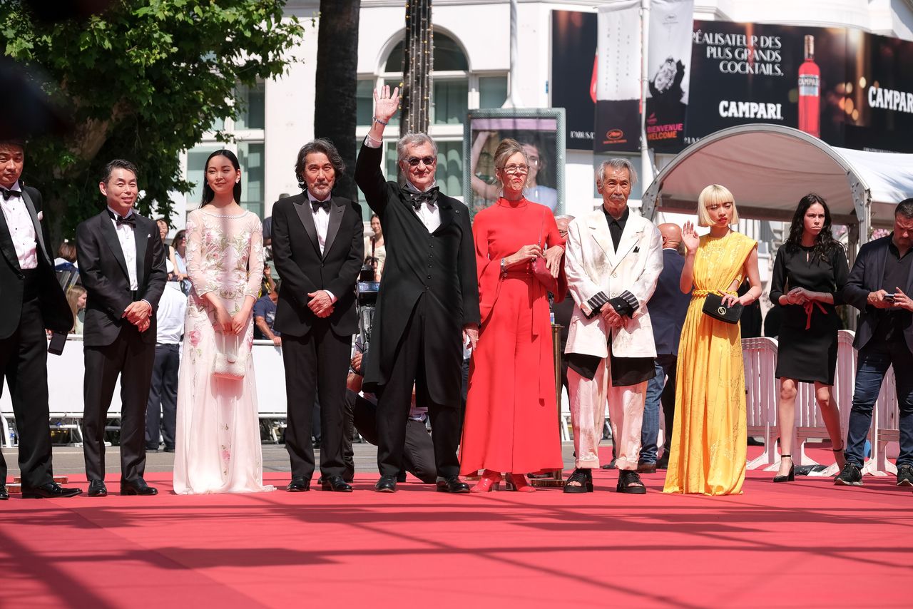 カンヌ映画祭のレッドカーペットの上で、観客に手を振るヴェンダース監督(中央)と役所広司(左隣)。左から2人目が製作の柳井康治氏 ©Kazuko Wakayama