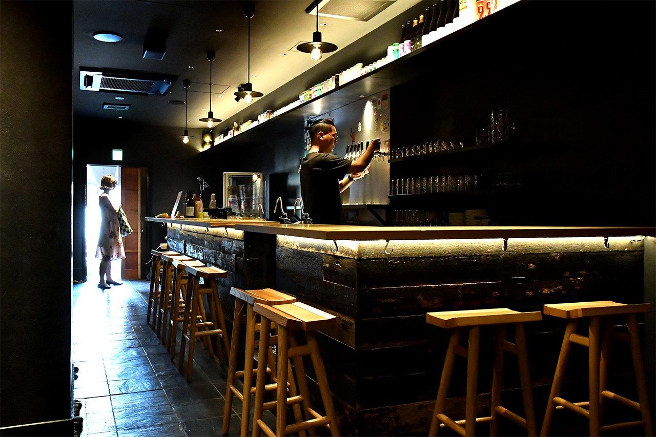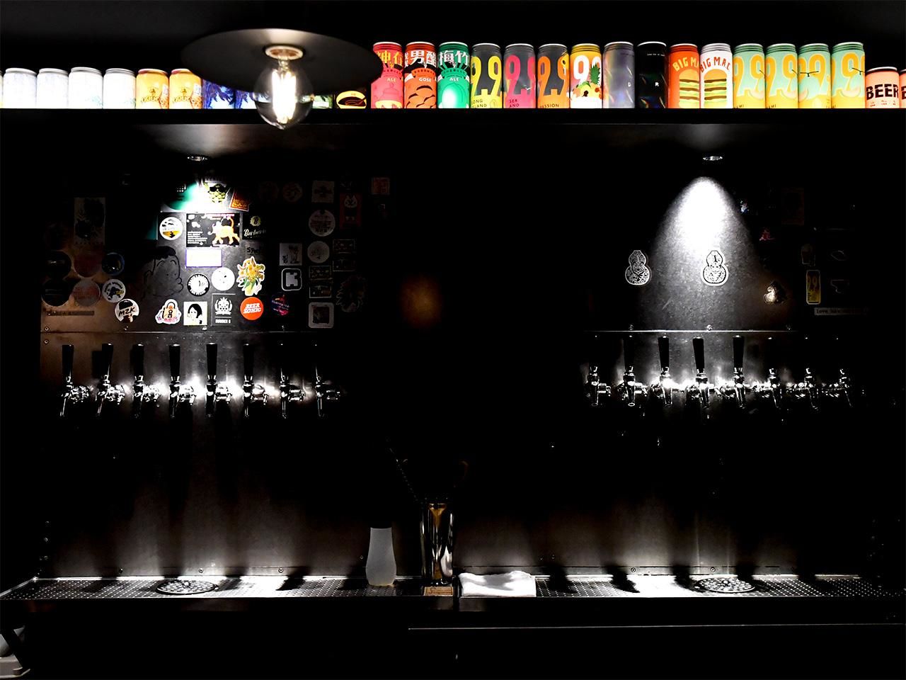 台湾料理店の明るい雰囲気をイメージしながら扉を開けると、目の前に飛び込んできたのはまるで都心の高級バーのような光景だった。ブラック系の壁紙とおしゃれなバーカウンターの後ろには十数本のビールサーバーの注ぎ口が見える。