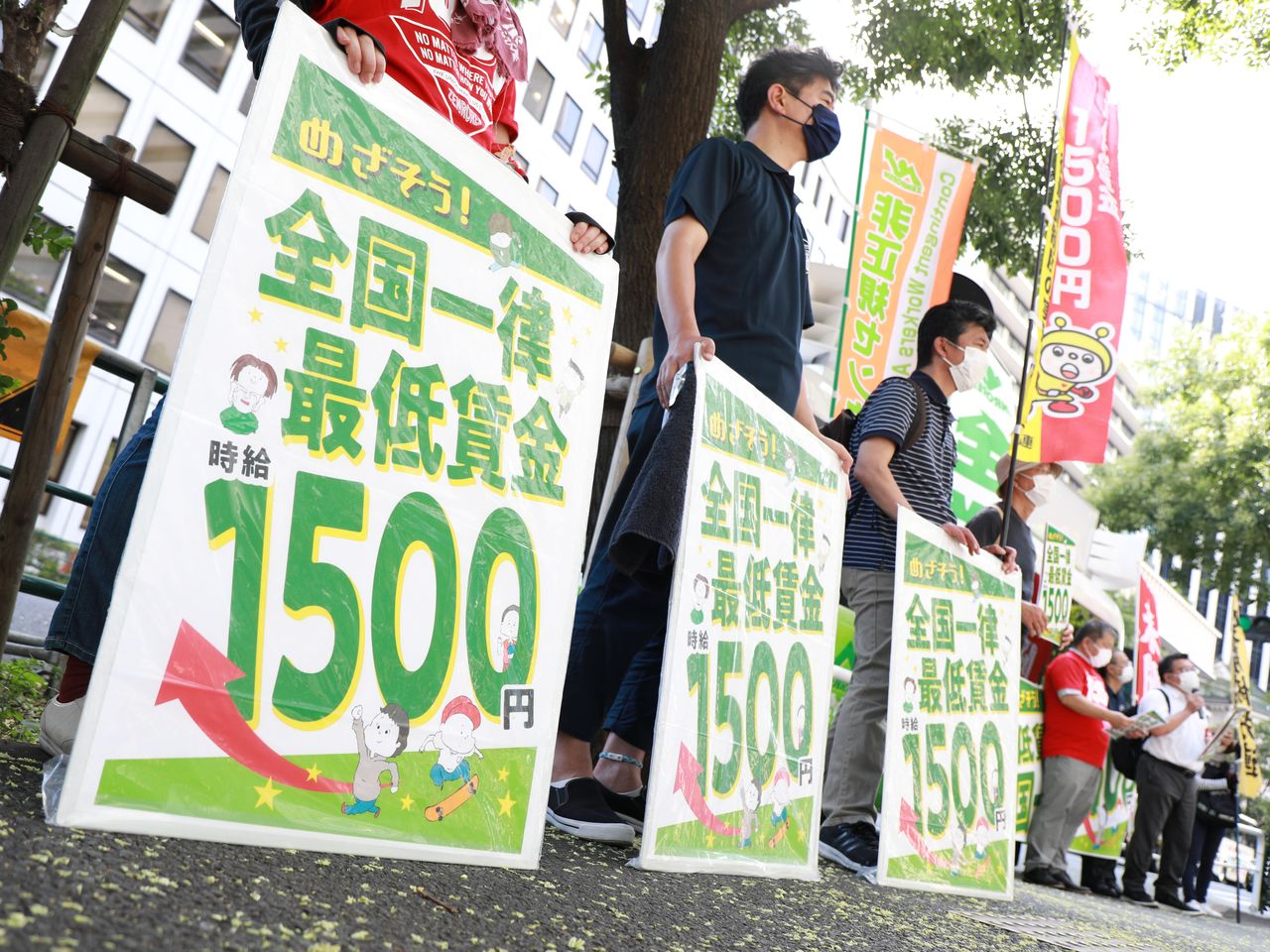 最低賃金を1500円に引き上げるよう求める人たち=東京都千代田区(時事)
