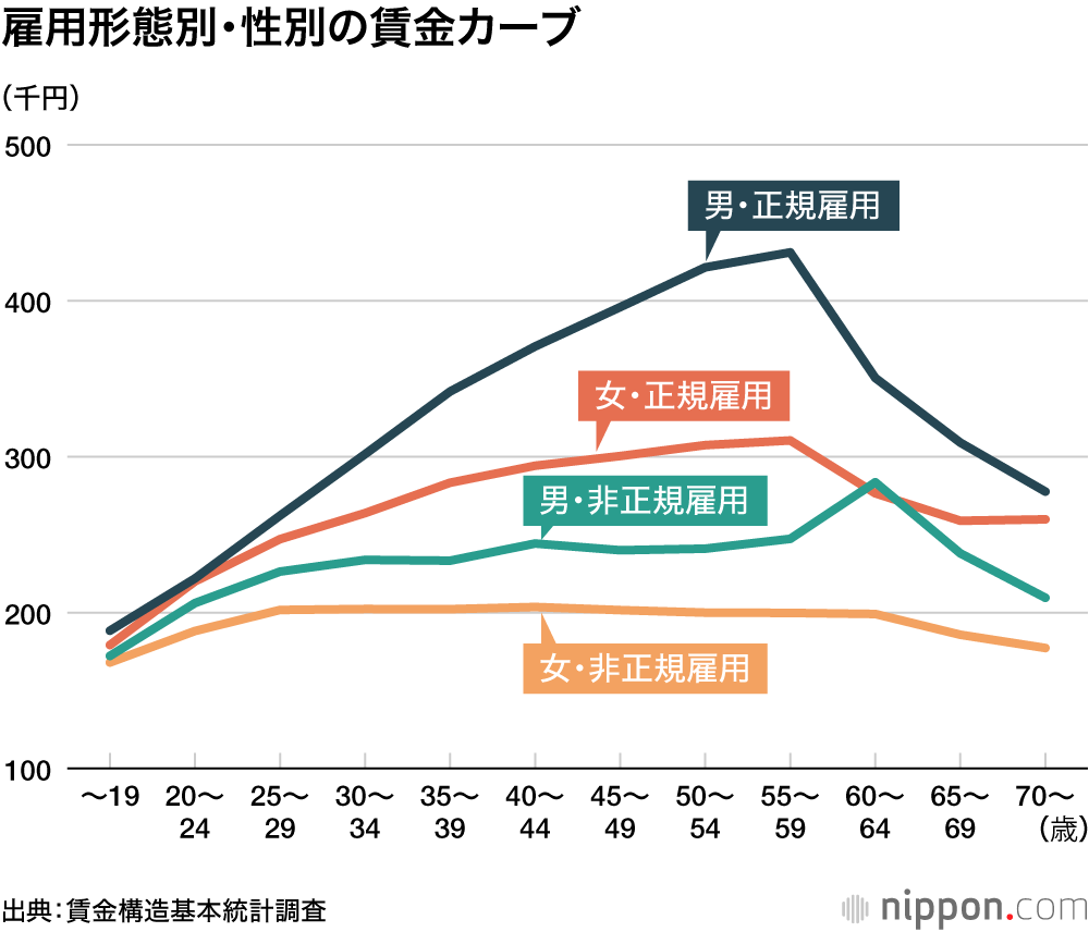 奨学金を借りた若い人たちが社会に出て直面する最大のリスクは、低収入だ。特に雇用者の4割を占める非正規社員は年齢を重ねても、賃金は低水準のまま、ほぼ横ばい。年齢に応じて緩やかに賃金が上昇する正社員との賃金格差は開いていく。さらに女性は男性よりも低賃金という性別格差もある。