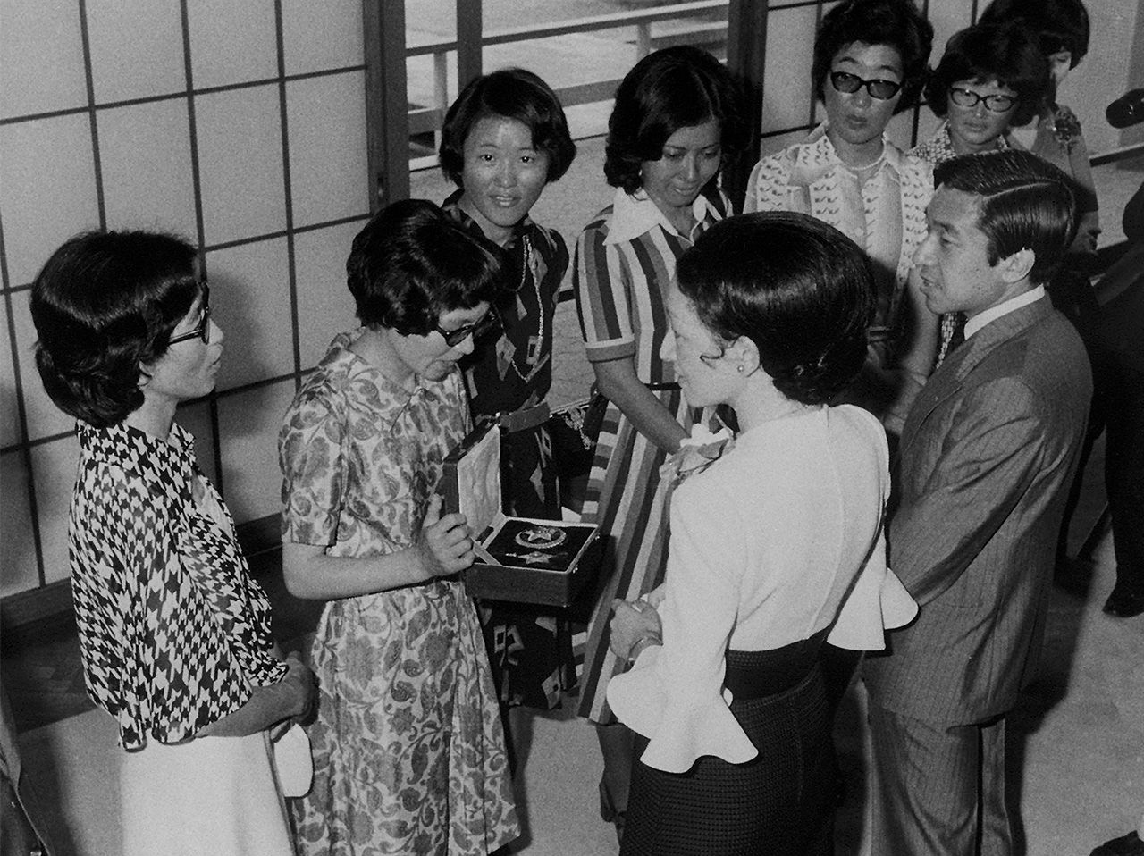 女性として初めてエベレスト登頂を果たした田部井淳子さん(左から2人目)は、東宮御所に招かれ当時の皇太子ご夫妻(東京・港区の東宮御所)と懇談した[代表撮影](1975年6月20日、時事)