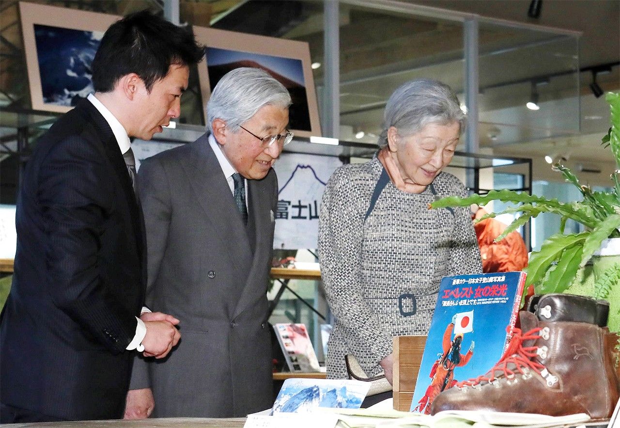 田部井淳子さんの回顧展を、長男進也さん(左)の説明を受けながら見学される天皇、皇后両陛下(2017年3月29日、東京都昭島市)(時事)