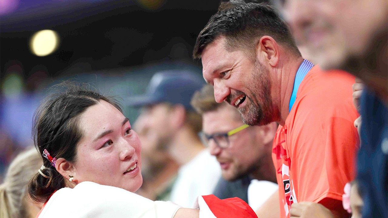 バナー写真:陸上女子やり投げで優勝し、セケラックコーチと喜びを分かち合う北口榛花=2024年8月10日、フランス・サンドニ(時事)