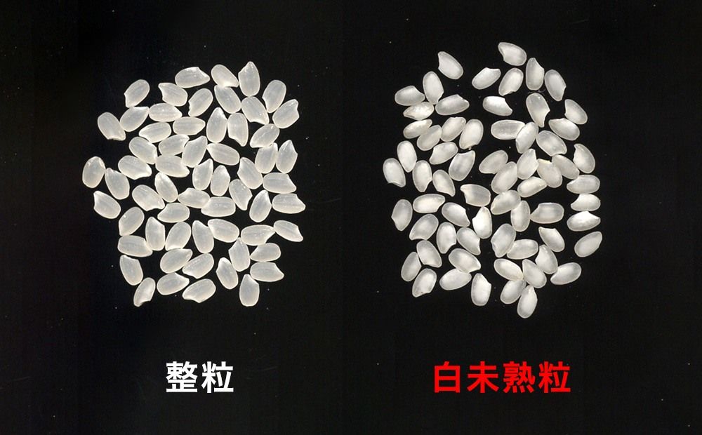 被害がなく、形が整っている米(左)と高温によってでんぷんの蓄積が不十分となり、白く濁った米(写真提供:農研機構)