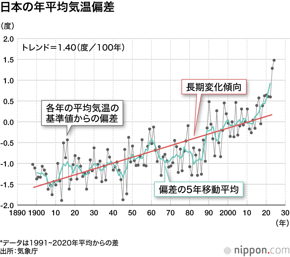 その日本で、2023年は気温がさらに激しく上がり、現在も上昇傾向が続いている(図参照)。