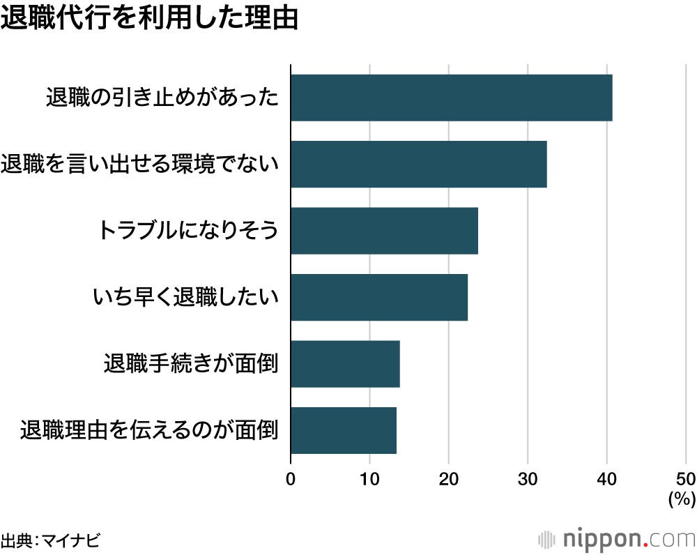 就職・転職サイトを運営するマイナビが2024年10月に公表した調査リポートによると、退職代行の利用理由(回答数800、複数回答)は「退職を引き止められた」「引き止められそうだから」(40.7%)に次いで、「自分から退職を言い出せる環境ではないから」(32.4%)が多い。実際に取材する中で耳にする機会が多いのは、後者のケースだ。