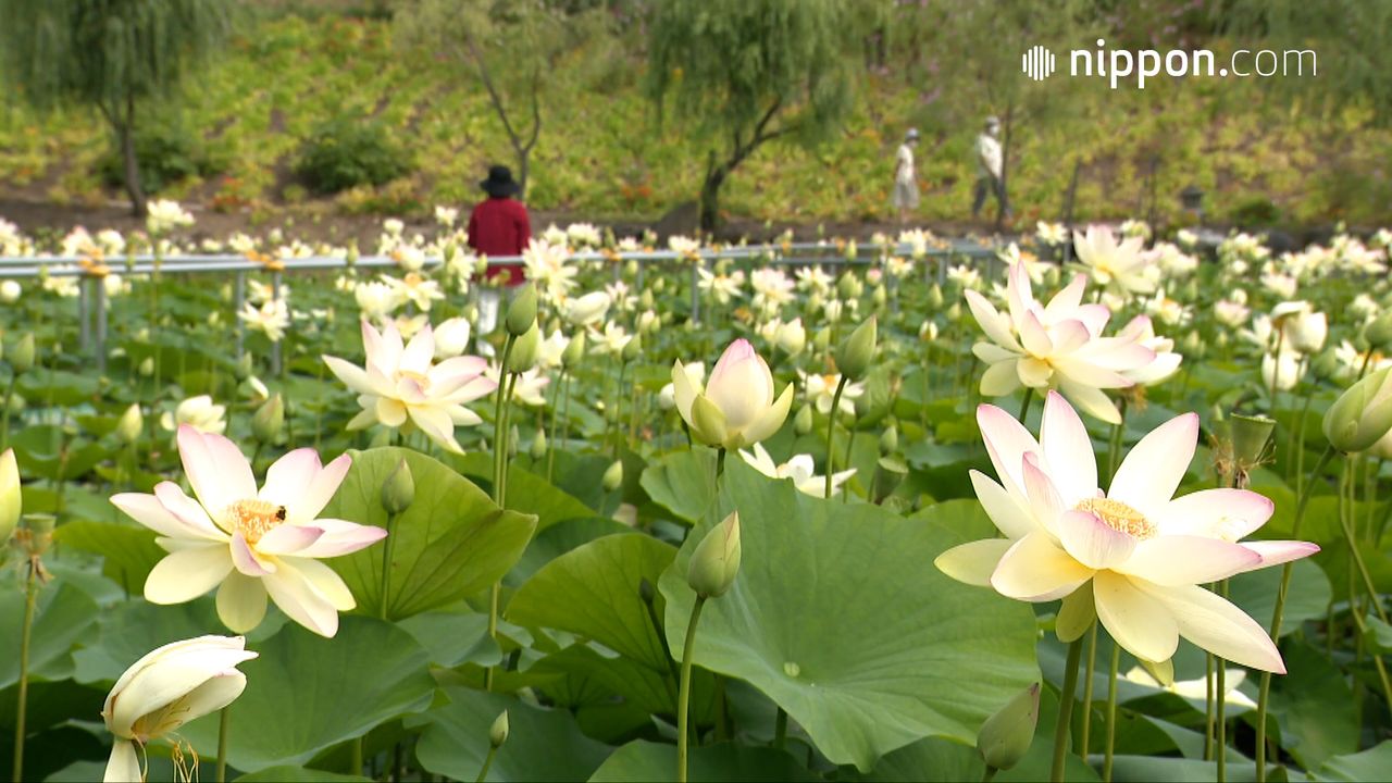 北海道北見市の「鏡池(かがみいけ)」ではハスの花が見ごろを迎え、にぎわいを見せている。白やピンクの花がおよそ3300平方メートルの池一面に広がる。