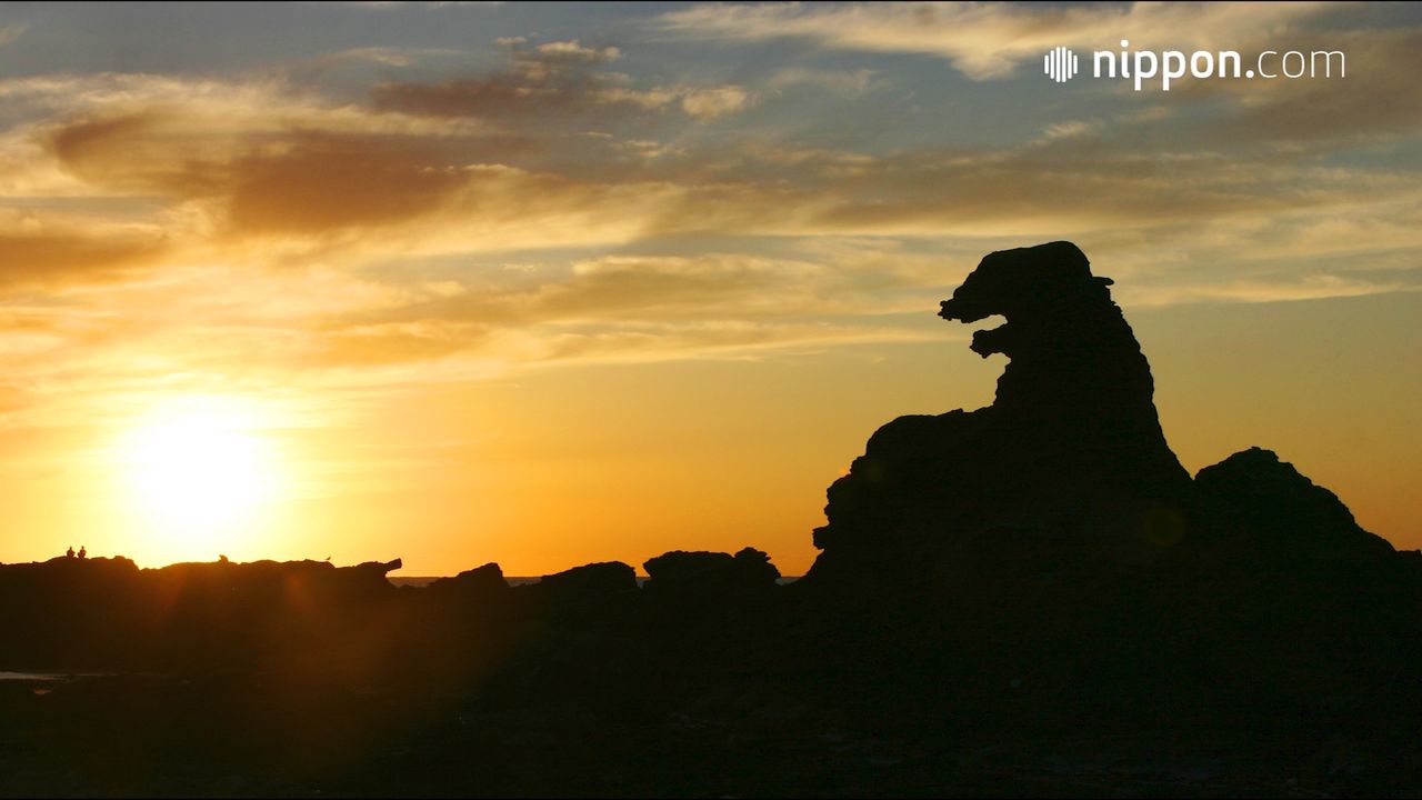 【ドローン動画】夕日に向かって「ガオーッ」:秋田・男鹿「ゴジラ岩」