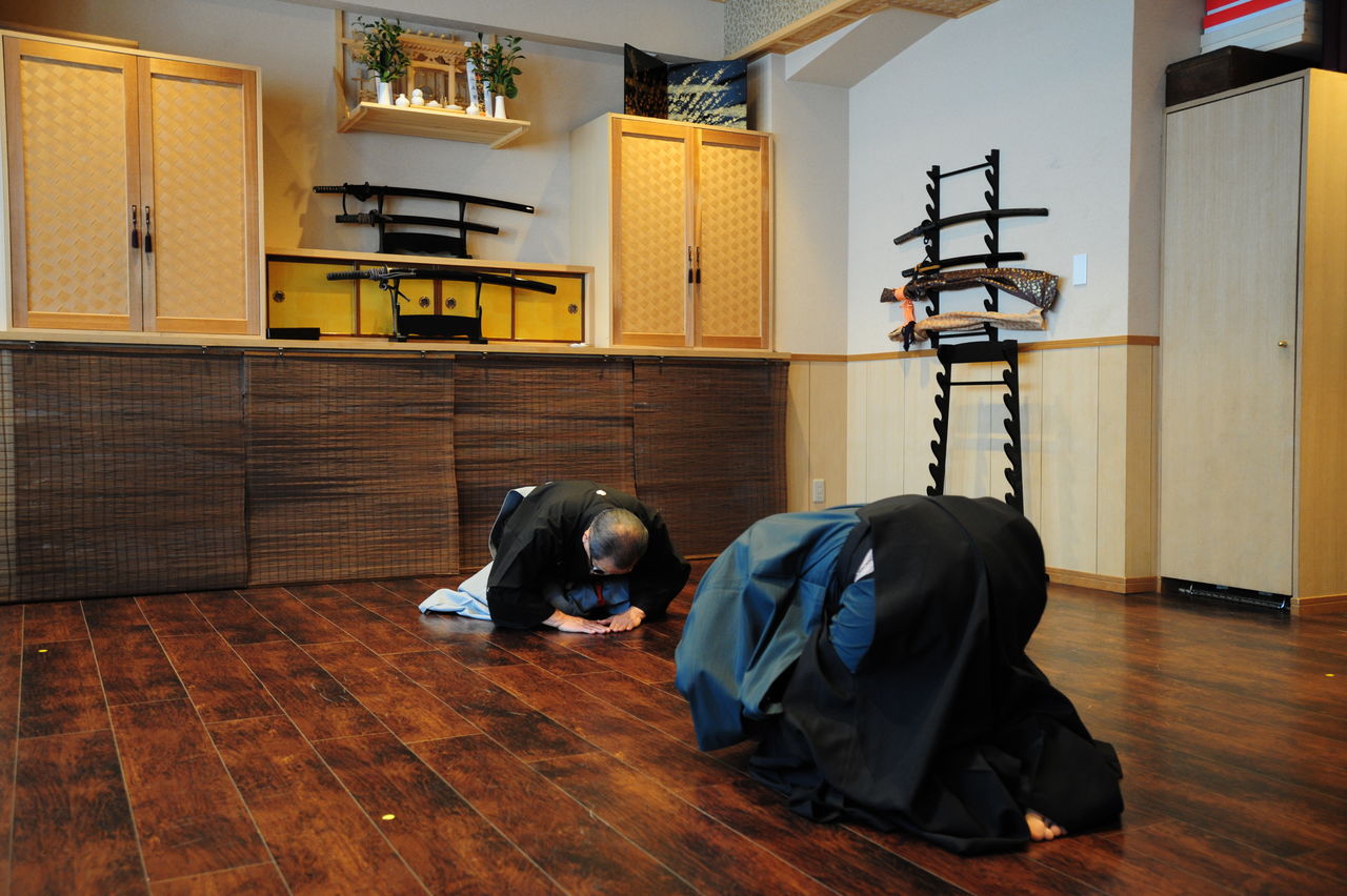 まずは挨拶から。体験レッスンの主眼は、抜刀のテクニックを学ぶのではなく、居合を通じて士道の心、和の美意識を学ぶこと。挨拶や歩き方、立ち姿など、武術の基本である「立ち居振る舞い」を身に付けることから始めていく。