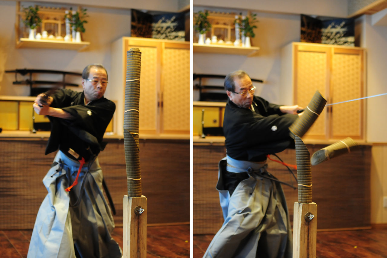 先生の神業。下方から斬り上げた巻き藁が空中にあるうちに、返す刀でさらに半分に寸断する