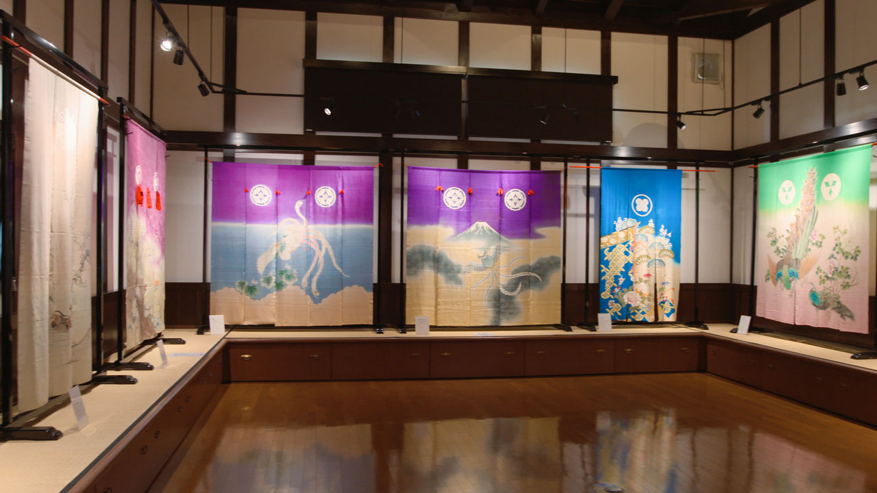 この町で幕末(19世紀半ば)から受け継がれてきた「花嫁のれん」は、嫁ぎ先の仏間に掛けられたのれんを、花嫁がくぐる婚礼時の風習。2016年開館の「花嫁のれん館」では、明治から平成まで約150年の間に作られた、彩り豊かな花嫁のれんが展示されている。