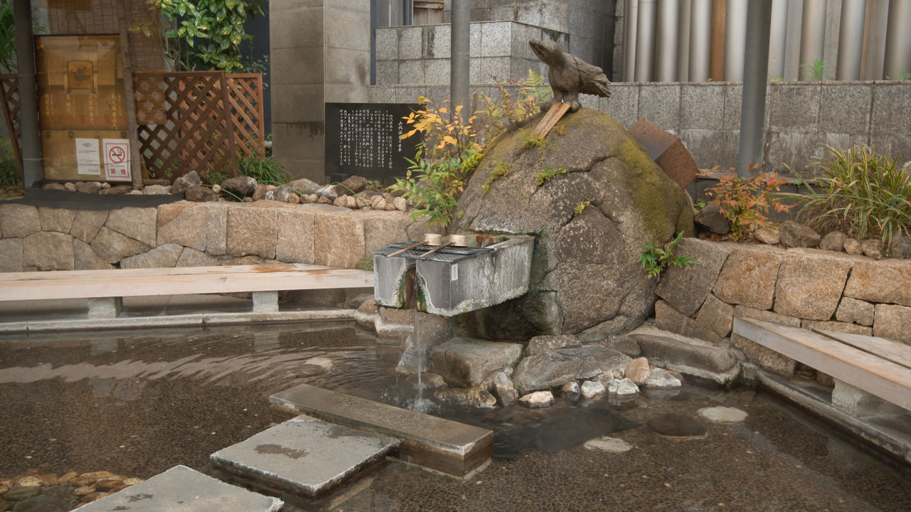 古総湯の近くには無料の足湯が整備されていて、ここの温泉水は飲むこともできる。岩の上で羽の傷を癒やす3本足の霊鳥の像は、山代温泉発祥伝説に関わる八咫烏(やたがらす)だ。