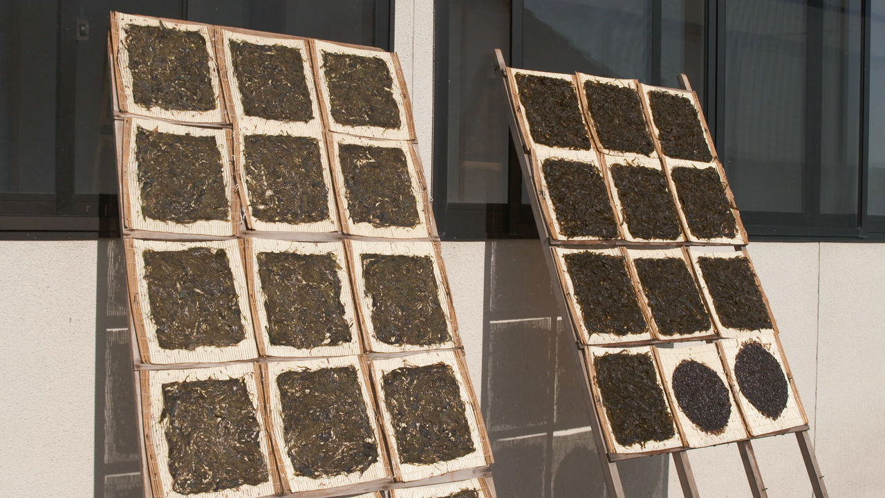 採集したのりは、竹かご(竹製の干しかご)に張り付ける。そのため、この時季の港や家々の軒下からは磯の香りが漂う。