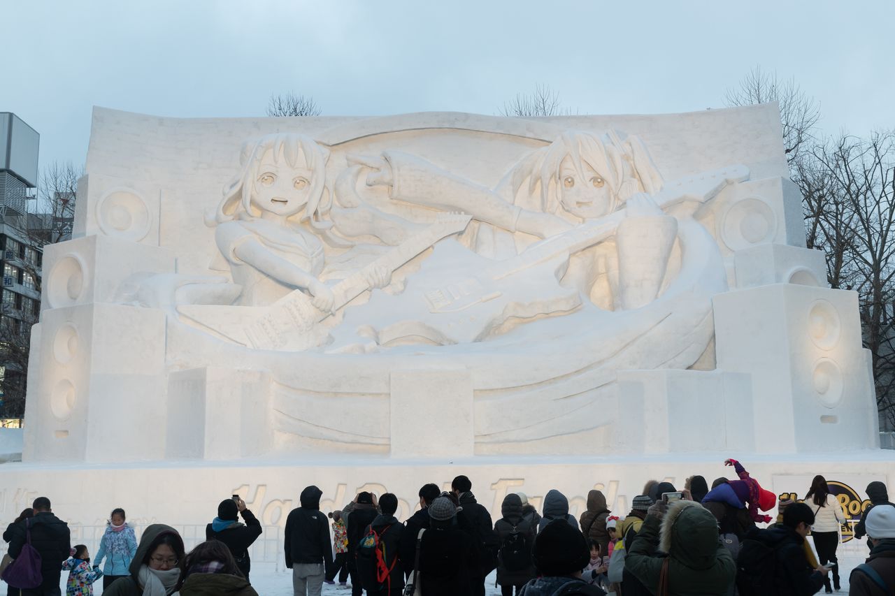 世界的な人気を誇るバーチャルシンガー・初音ミクが北海道の形をしたギターを手に、スマホ・ゲーム『バンドリ! ガールズバンドパーティ!』の戸山香澄とユニットを組む大雪像 ©BDP ©CraftEgg ©BUSHI ©CFM All Rights Reserved. 協賛:ハードロック・ジャパン 雪像企画:STV