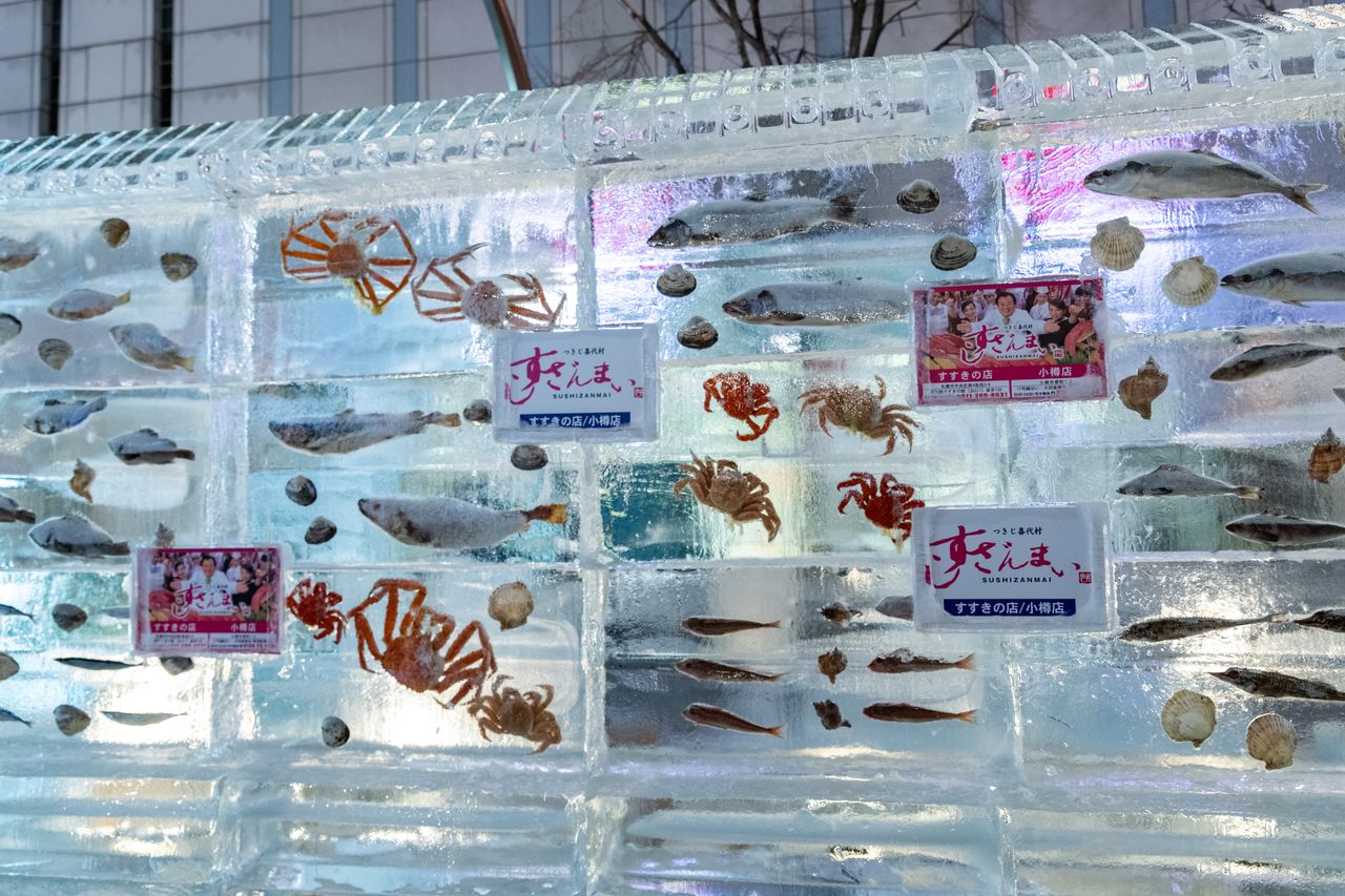 すしネタになる魚介類を、泳いでいたまま凍らせたような「すしざんまい」の氷像
