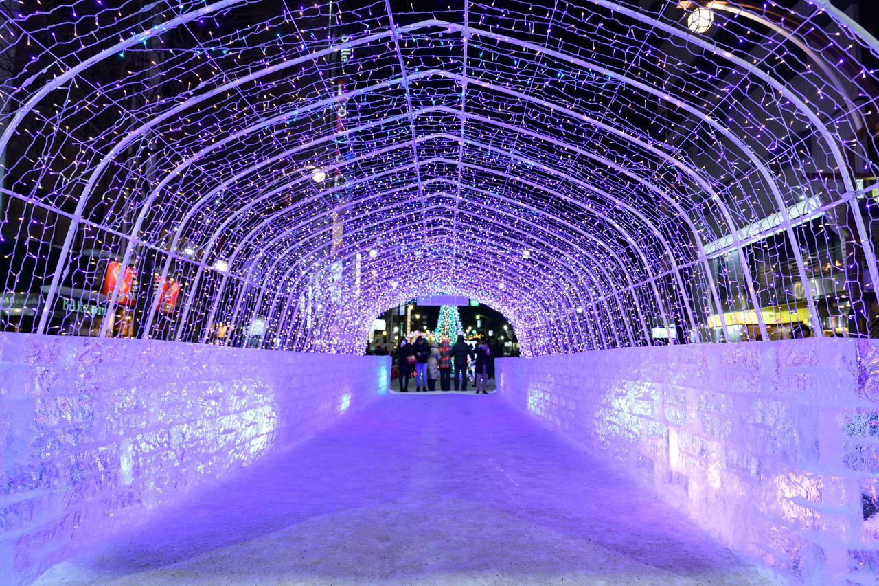 氷のブロックの上にきらびやかな電飾のトンネルが造られた「イルミネーションロード」は、毎年人気のフォトスポット