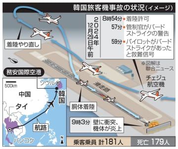 韓国旅客機事故、原因究明に時間 179人が死亡、発生1週間 Newsfrom Japan 国際・海外 2025.01.05 18:39 / 2025.01.05 22:33 更新 English 日本語 简体字 繁體字 Français Español العربية Русский 韓国旅客機事故の状況イメージ(図解は聯合ニュース)【ソウル共同】韓国南西部の務安国際空港で179人が死亡した旅客機事故から5日で1週間。鳥と衝突するバ...記事全文を読む(外部サイト画面を表示します) 共同通信ニュース 国際