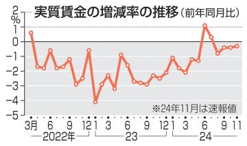 実質賃金、4カ月連続マイナス 11月、0.3%減 Newsfrom Japan 経済・ビジネス 2025.01.09 08:45 / 2025.01.09 08:47 更新 English 日本語 简体字 繁體字 Français Español العربية Русский 実質賃金の増減率の推移厚生労働省が9日公表した2024年11月の毎月勤労統計調査(速報、従業員5人以上)によると、物価変動...記事全文を読む(外部サイト画面を表示します) 共同通信ニュース 経済