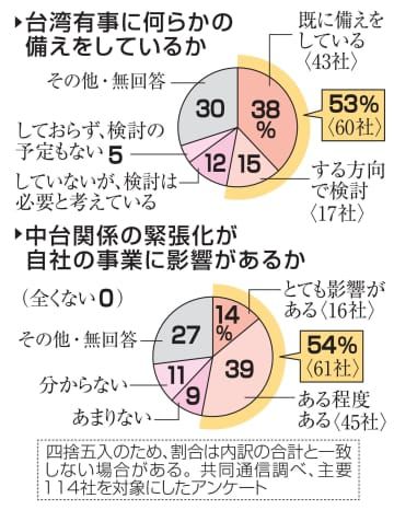 「台湾有事」に企業53%備え 退避計画の策定など警戒強く Newsfrom Japan 経済・ビジネス 2025.01.11 21:01 / 2025.01.11 21:17 更新 English 日本語 简体字 繁體字 Français Español العربية Русский 台湾有事に何らかの備えをしているか、中台関係の緊張化が自社の事業に影響があるか共同通信社は11日、中国が台湾に武力侵攻する「台湾有事」に関し、主要114社を対象に実施したアンケー...記事全文を読む(外部サイト画面を表示します) 共同通信ニュース 経済