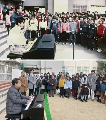 1995年2月、初めて「しあわせ運べるように」の合唱を披露する臼井真さん(手前左)と児童ら。下は2024年12月、同じ場所で当時の教え子らと約30年ぶりに合唱した=神戸市中央区(いずれも本人提供)