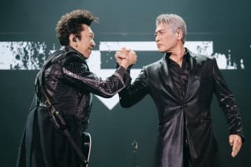 能登半島地震の復興支援チャリティーライブを開いた「COMPLEX」の吉川晃司さん(右)と布袋寅泰さん=2024年5月、東京ドーム(山本倫子撮影)