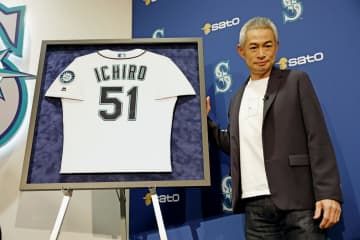 アジア人で初めての米国野球殿堂入りし、永久欠番となった背番号51のユニホームと記念撮影するイチローさん=21日、シアトル(共同)