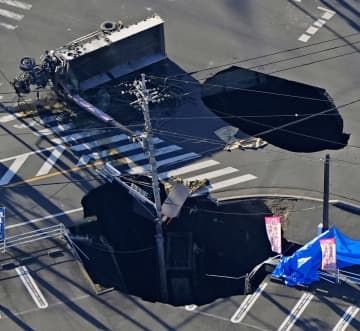道路が陥没しトラックが転落した穴(上)と引き上げられた荷台部分。手前は未明の作業中に新たに発生した陥没=29日午前8時23分、埼玉県八潮市(共同通信社ヘリから)