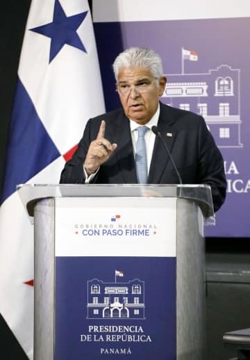 ルビオ米国務長官との会談を終え記者会見するパナマのムリノ大統領=2日、パナマ市(共同)
