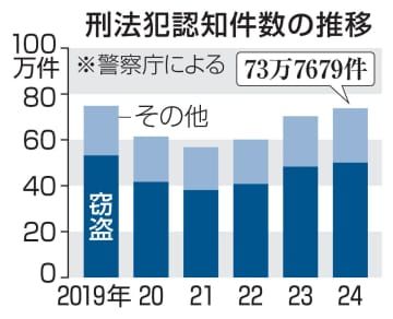 刑法犯が3年連続で増加 73万件、コロナ禍前に迫る Newsfrom Japan 社会 2025.02.06 10:25 / 2025.02.06 10:41 更新 English 日本語 简体字 繁體字 Français Español العربية Русский 刑法犯認知件数の推移警察庁の統計によると、2024年に全国の警察が認知した刑法犯は、前年比3万4328件増の73万767...記事全文を読む(外部サイト画面を表示します) 共同通信ニュース 社会