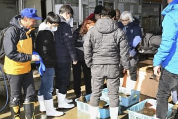 IAEAの枠組みの下、放射性物質を分析するサンプルを選定する中国の分析機関の担当者(左から2人目)ら=20日午前、福島県いわき市の沼之内漁港