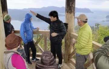 鹿児島県宇検村の観光名所を巡るバスツアーで、海が一望できる展望台を訪れた参加者ら=24日午後